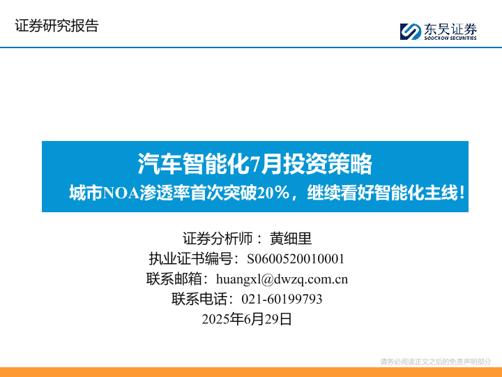 【东吴证券】【20250629】汽车智能化7月投资策略:城市NOA渗透率首次突破20%,继续看好智能化主线!-46页