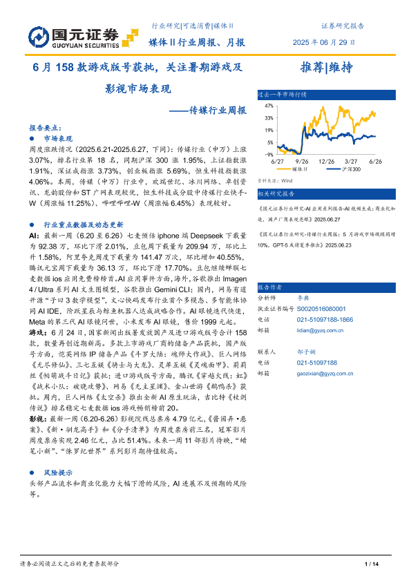 【国元证券】【20250629】6月158款游戏版号获批,关注暑期游戏及影视市场表现-14页