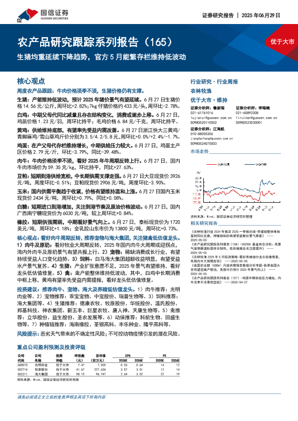 【国信证券】【20250629】农产品研究跟踪系列报告(165):生猪均重延续下降趋势,官方5月能繁存栏维持低波动-27页