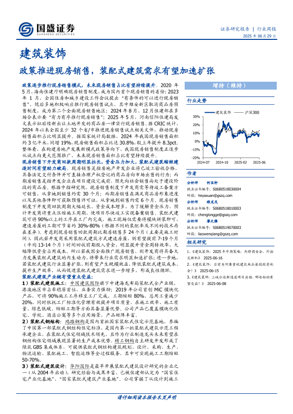 【国盛证券】【20250629】建筑装饰行业周报:政策推进现房销售,装配式建筑需求有望加速扩张-10页