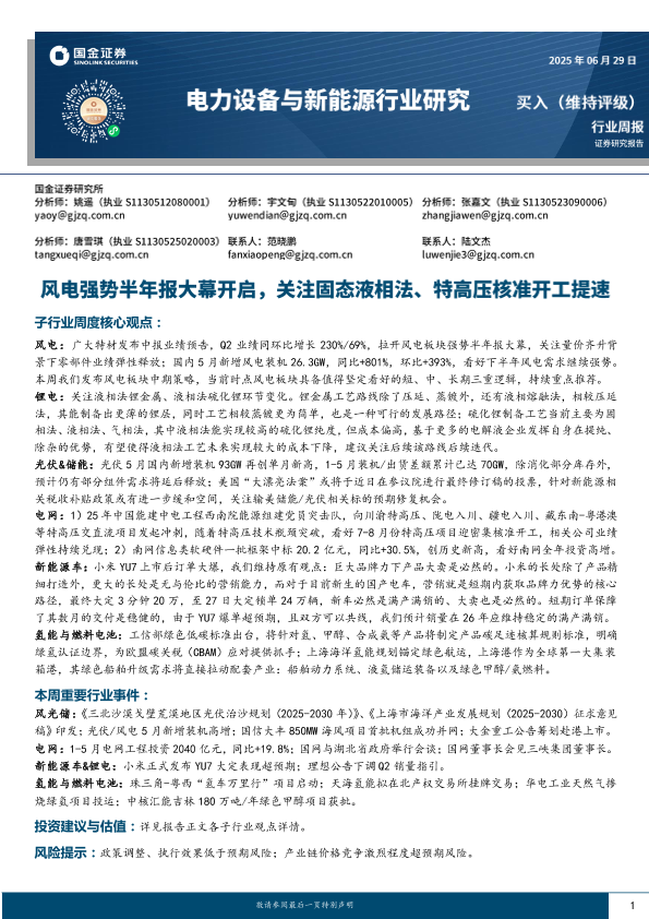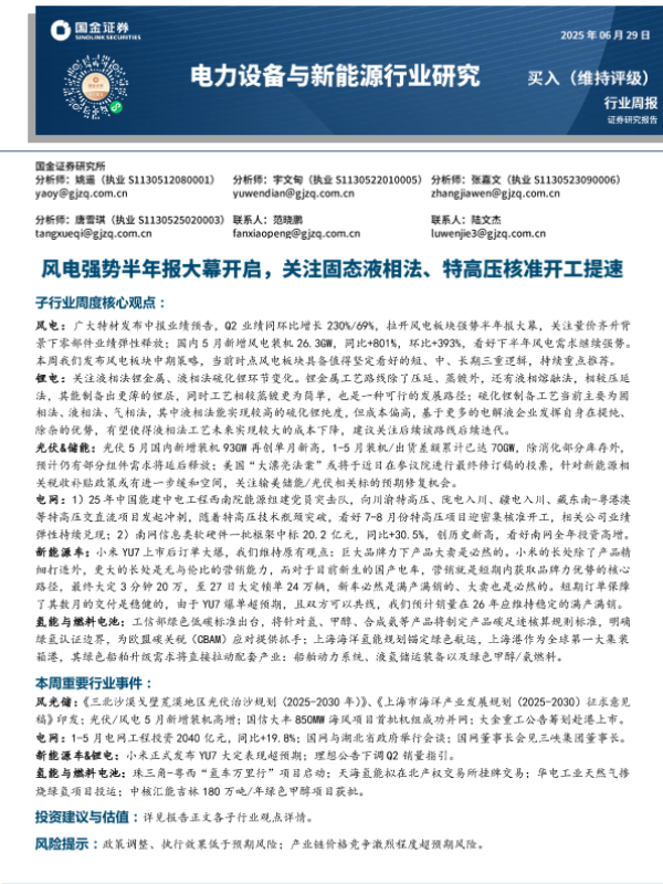 【国金证券】【20250629】电力设备与新能源行业研究:风电强势半年报大幕开启,关注固态液相法、特高压核准开工提速-15页
