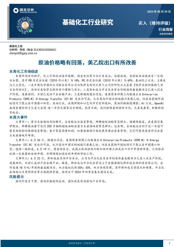 【国金证券】【20250629】基础化工行业研究:原油价格略有回落,美乙烷出口有所改善-22页
