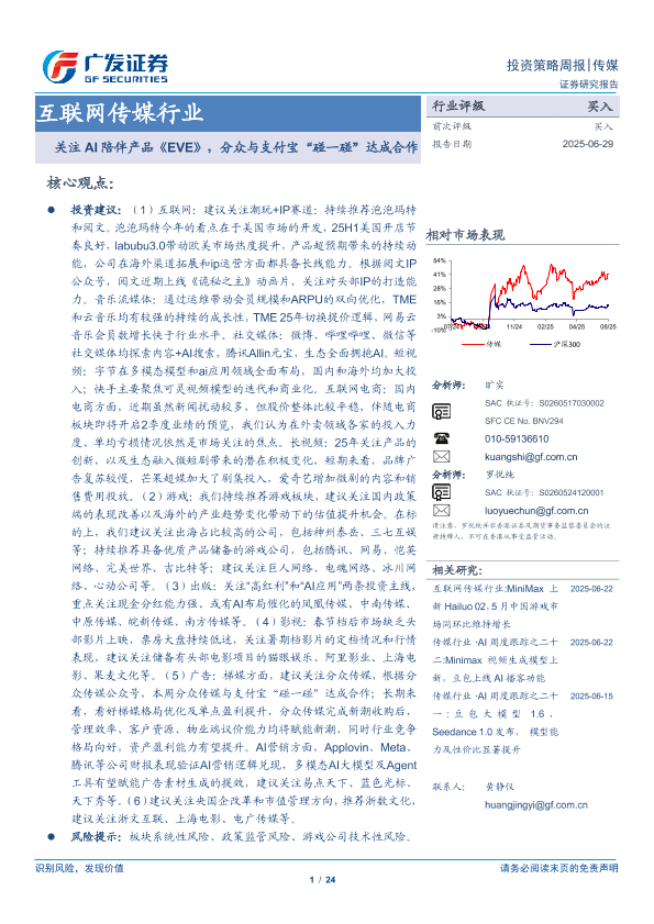 【广发证券】【20250629】互联网传媒行业投资策略周报:关注AI陪伴产品《EVE》,分众与支付宝“碰一碰”达成合作-24页