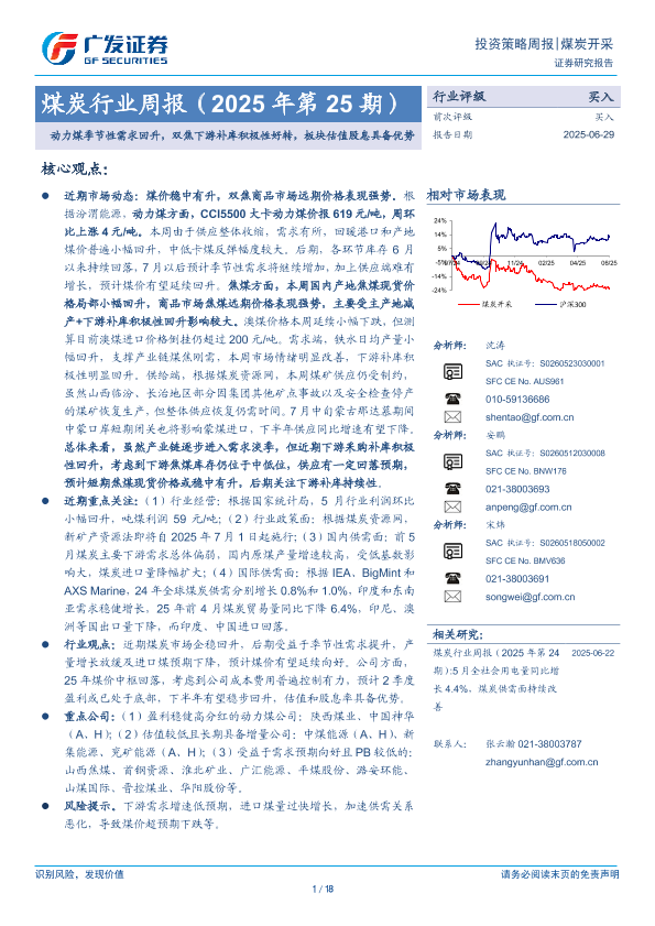 【广发证券】【20250629】煤炭行业周报(2025年第25期):动力煤季节性需求回升,双焦下游补库积极性好转,板块估值股息具备优势-18页