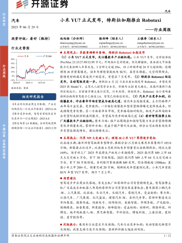 【开源证券】【20250629】小米YU7正式发布,特斯拉如期推出Robotaxi-12页