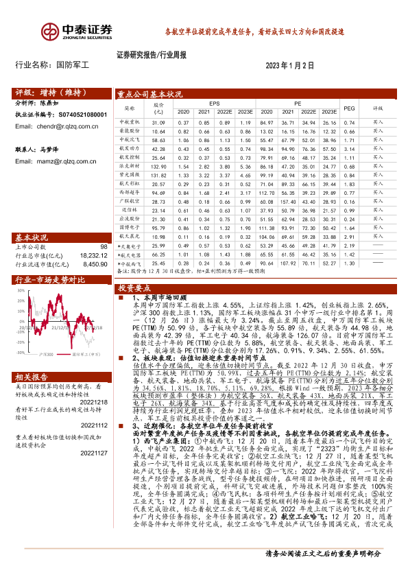 【中泰证券】【20230102】国防军工行业周报:各航空单位提前完成年度任务,看好成长四大方向和国改提速-19页