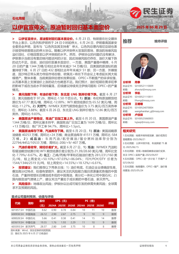 【民生证券】【20250629】石化周报:以伊官宣停火,原油暂时回归基本面定价-29页