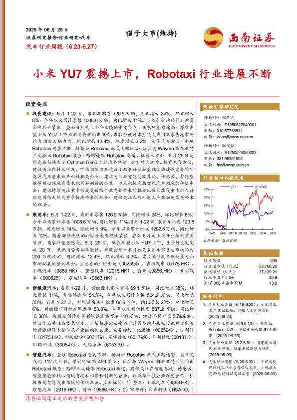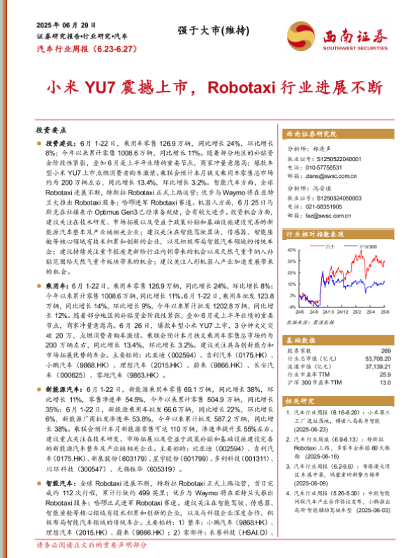 【西南证券】【20250629】汽车行业周报:小米YU7震撼上市,Robotaxi行业进展不断-21页