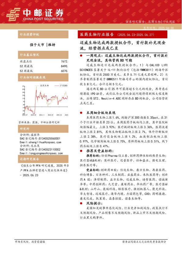 【中邮证券】【20250630】医药生物行业报告:迈威生物达成两款授权合作,首付款补充现金流,经营拐点或已至-16页