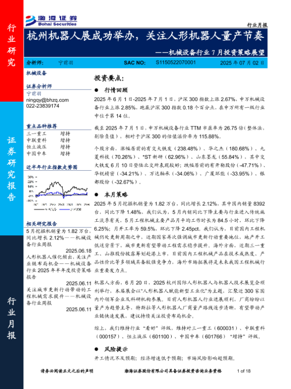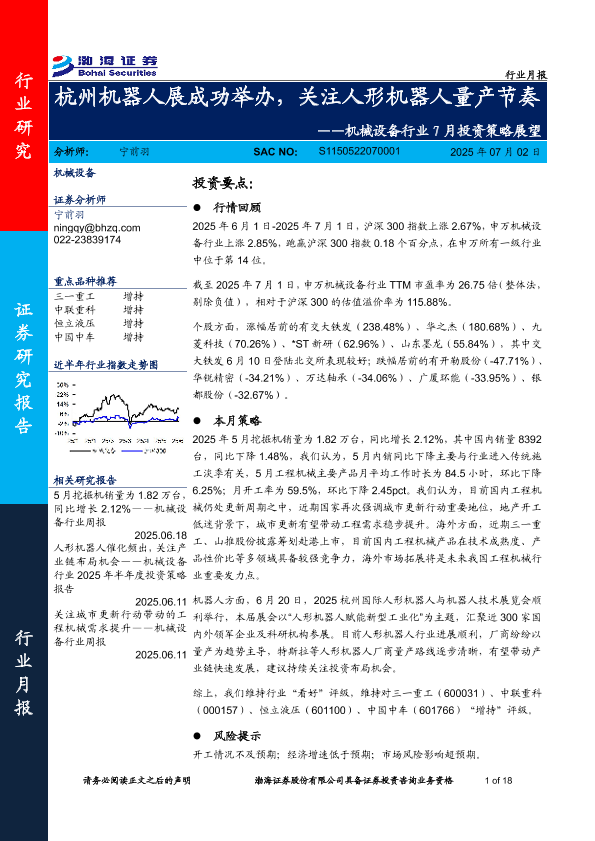 【渤海证券】【20250702】机械设备行业7月投资策略展望:杭州机器人展成功举办,关注人形机器人量产节奏-18页
