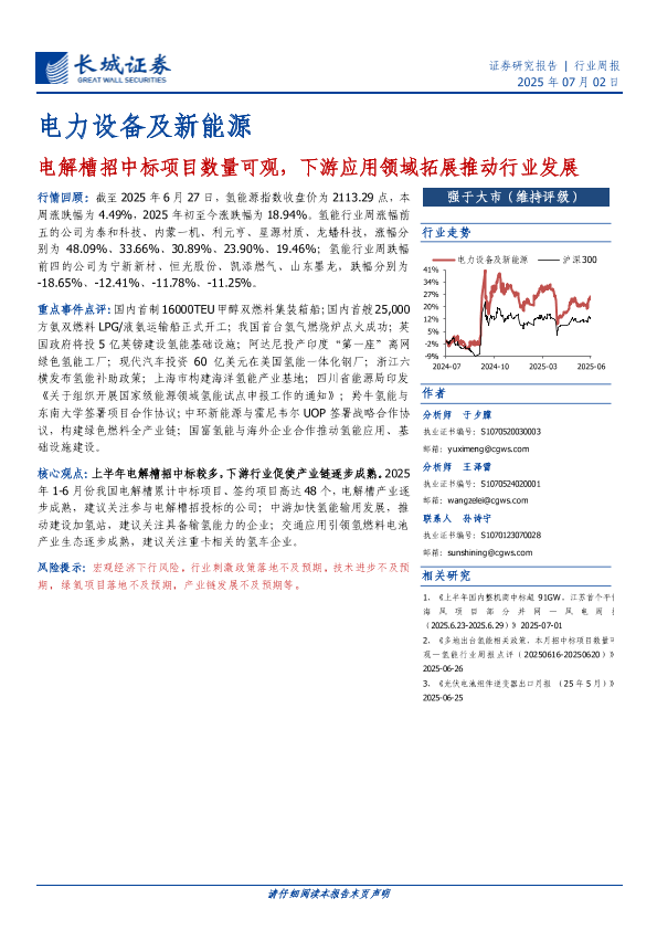 【长城证券】【20250702】电力设备及新能源行业周报:电解槽招中标项目数量可观,下游应用领域拓展推动行业发展-12页