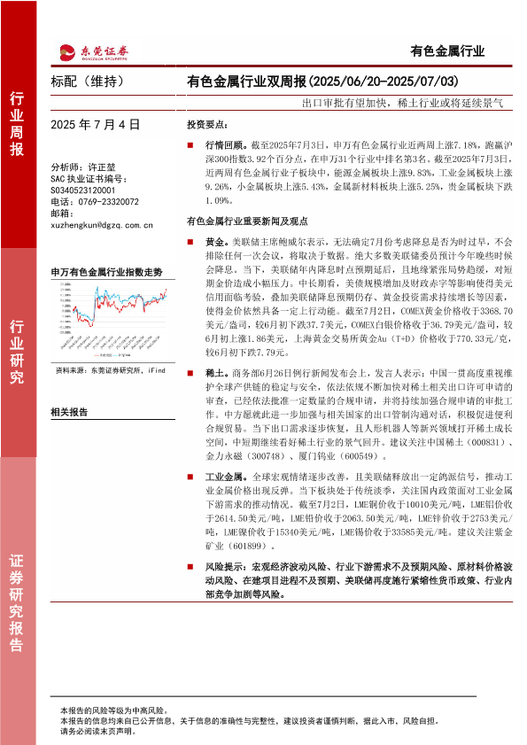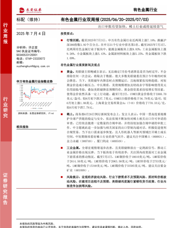 【东莞证券】【20250704】有色金属行业双周报:出口审批有望加快,稀土行业或将延续景气-12页