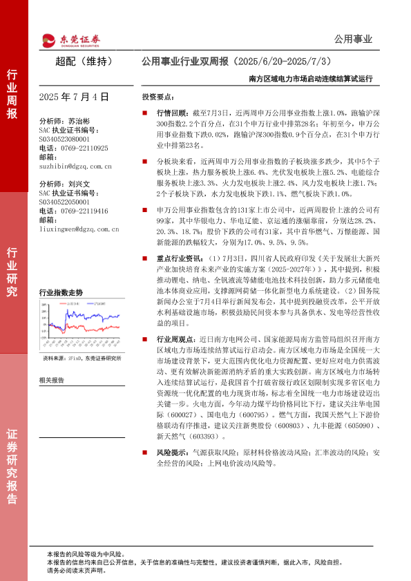 【东莞证券】【20250704】公用事业行业双周报:南方区域电力市场启动连续结算试运行-10页