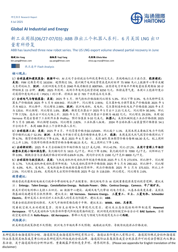 【海通国际】【20250704】新工业周报:ABB推出三个机器人系列,6月美国LNG出口量有所修复-40页