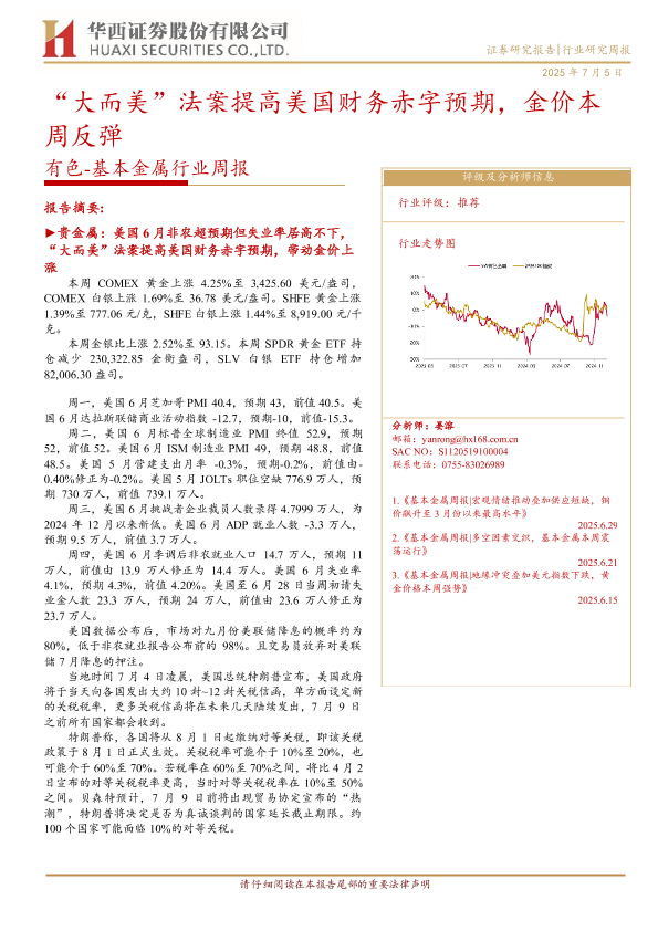 【华西证券】【20250705】“大而美”法案提高美国财务赤字预期,金价本周反弹-22页