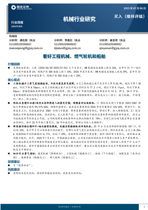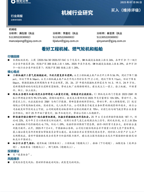 【国金证券】【20250706】机械行业周报:看好工程机械、燃气轮机和船舶-16页