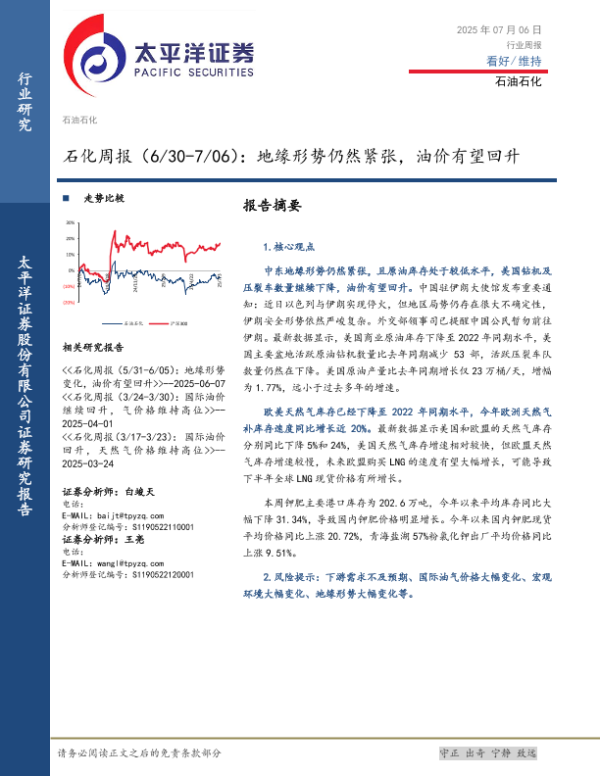 【太平洋证券】【20250706】石化周报:地缘形势仍然紧张,油价有望回升-18页