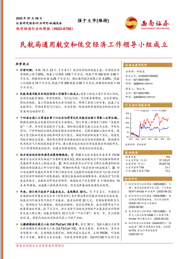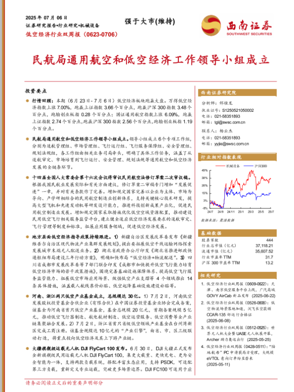 【西南证券】【20250706】低空经济行业双周报:民航局通用航空和低空经济工作领导小组成立-14页