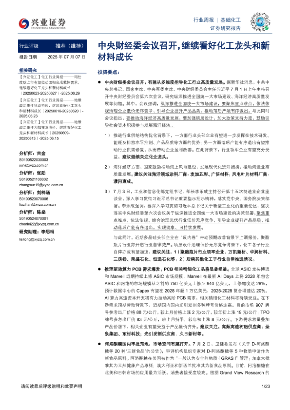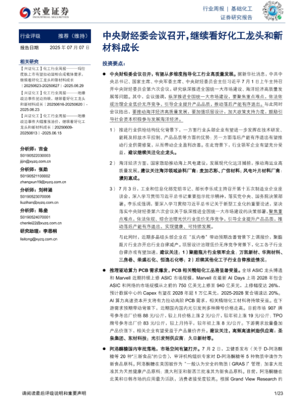 【兴业证券】【20250707】基础化工行业周报:中央财经委会议召开,继续看好化工龙头和新材料成长-23页