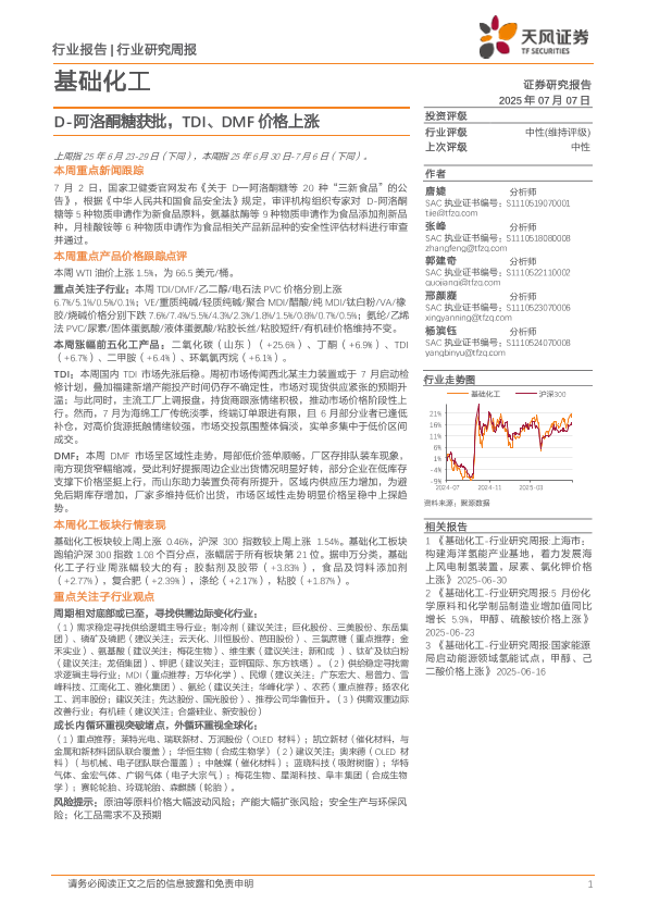 【天风证券】【20250707】基础化工行业研究周报:D-阿洛酮糖获批,TDI、DMF价格上涨-21页
