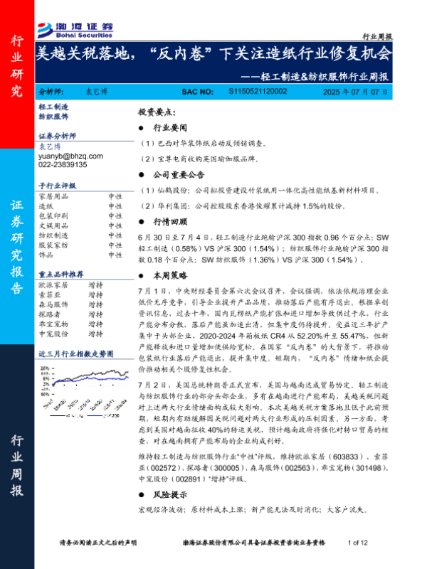 【渤海证券】【20250707】轻工制造&纺织服饰行业周报:美越关税落地,“反内卷”下关注造纸行业修复机会-12页
