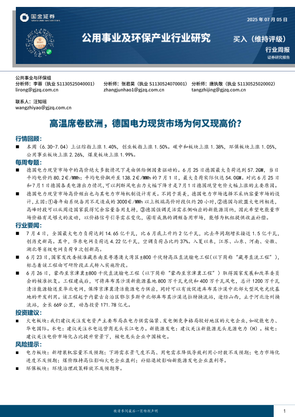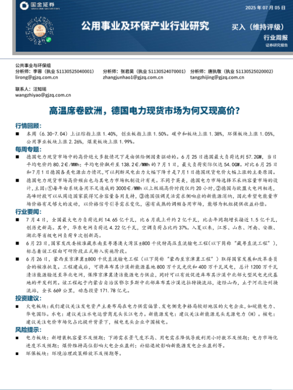【国金证券】【20250705】公用事业及环保产业行业研究:高温席卷欧洲,德国电力现货市场为何又现高价?-18页