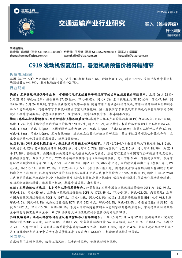 【国金证券】【20250705】交通运输产业行业研究:C919发动机恢复出口,暑运机票预售价格降幅缩窄-17页