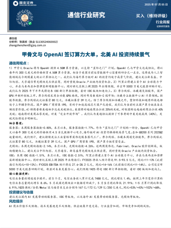 【国金证券】【20250705】通信行业研究:甲骨文与OpenAI签订算力大单,北美AI投资持续景气-11页