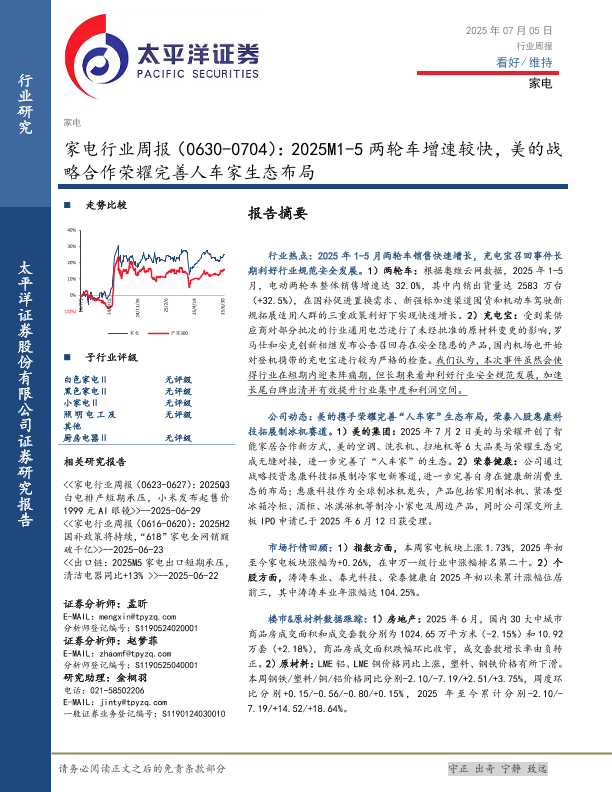 【太平洋证券】【20250705】家电行业周报:2025M1-5两轮车增速较快,美的战略合作荣耀完善人车家生态布局-15页