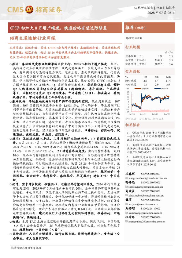 【海通证券】【20250705】招商交通运输行业周报:OPEC+拟加大8月增产幅度,快递价格有望边际修复-15页