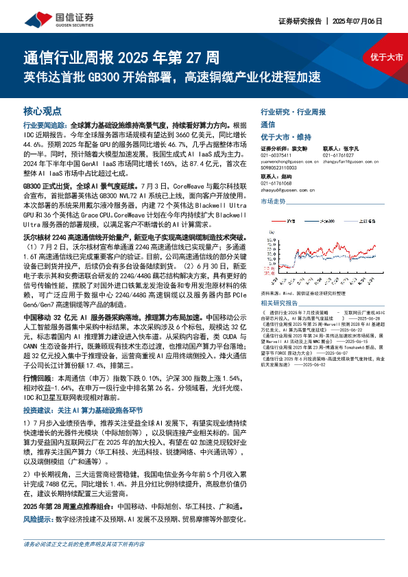 【国信证券】【20250706】通信行业周报2025年第27周:英伟达首批GB300开始部署,高速铜缆产业化进程加速-16页