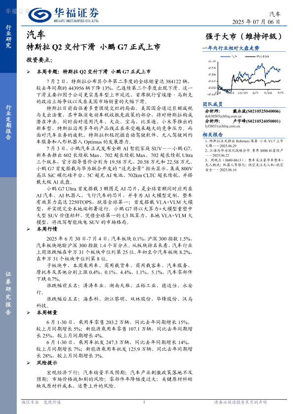 【华福证券】【20250706】汽车:特斯拉Q2交付下滑 小鹏G7正式上市-12页