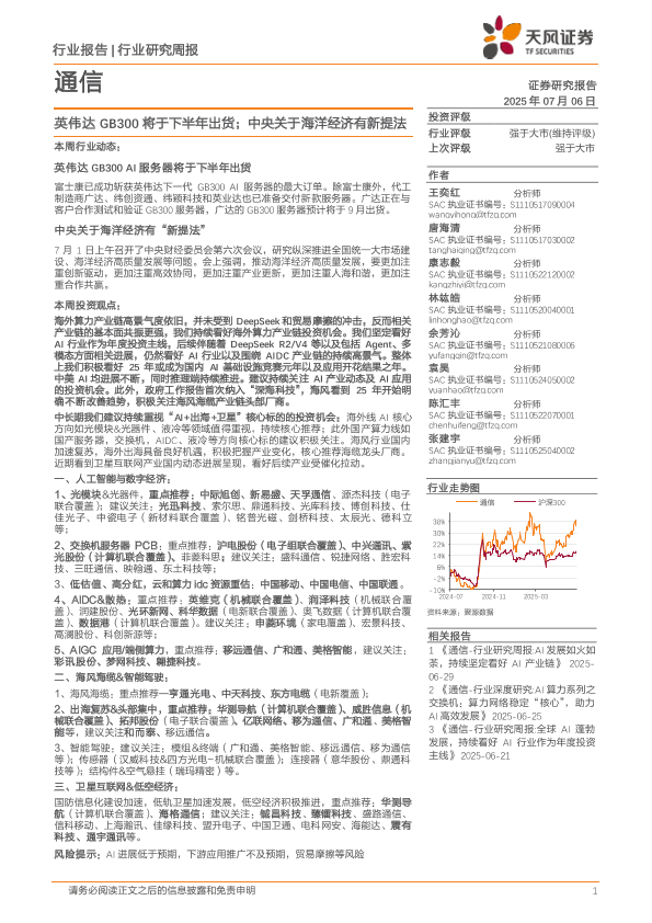 【天风证券】【20250706】通信行业研究周报:英伟达GB300将于下半年出货;中央关于海洋经济有新提法-12页