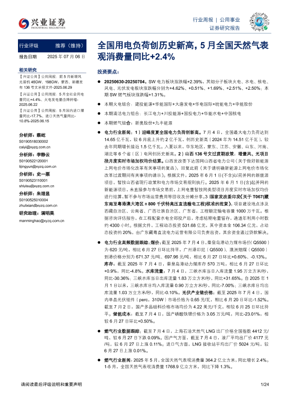 【兴业证券】【20250706】公用事业行业周报:全国用电负荷创历史新高,5月全国天然气表观消费量同比+2.4%-24页