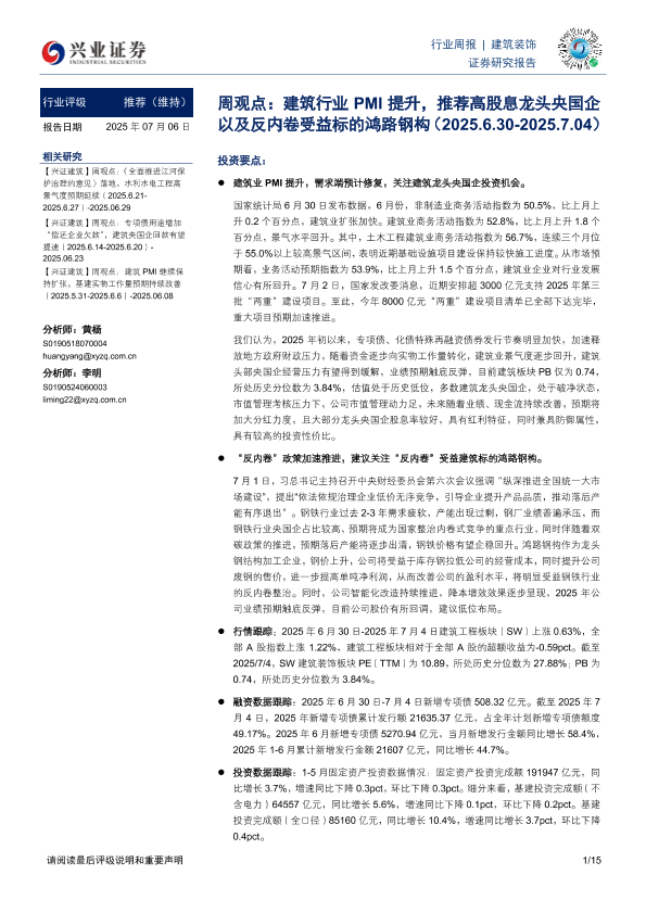 【兴业证券】【20250706】建筑装饰周观点:建筑行业PMI提升,推荐高股息龙头央国企以及反内卷受益标的鸿路钢构-15页