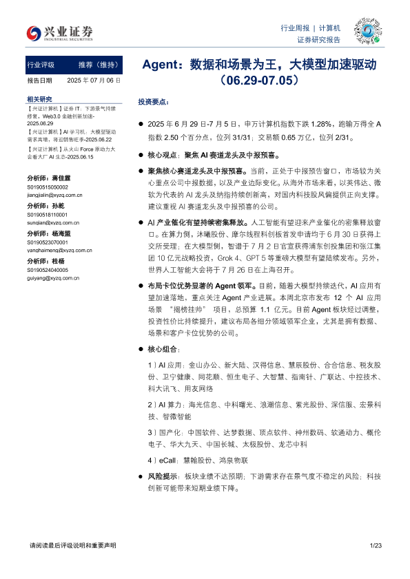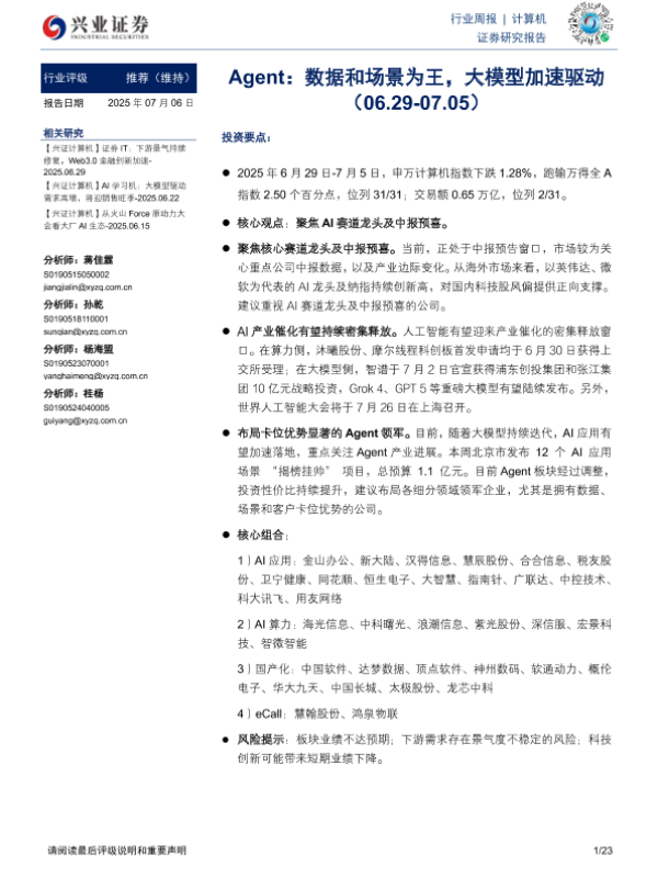 【兴业证券】【20250706】计算机行业周报:Agent:数据和场景为王,大模型加速驱动-23页
