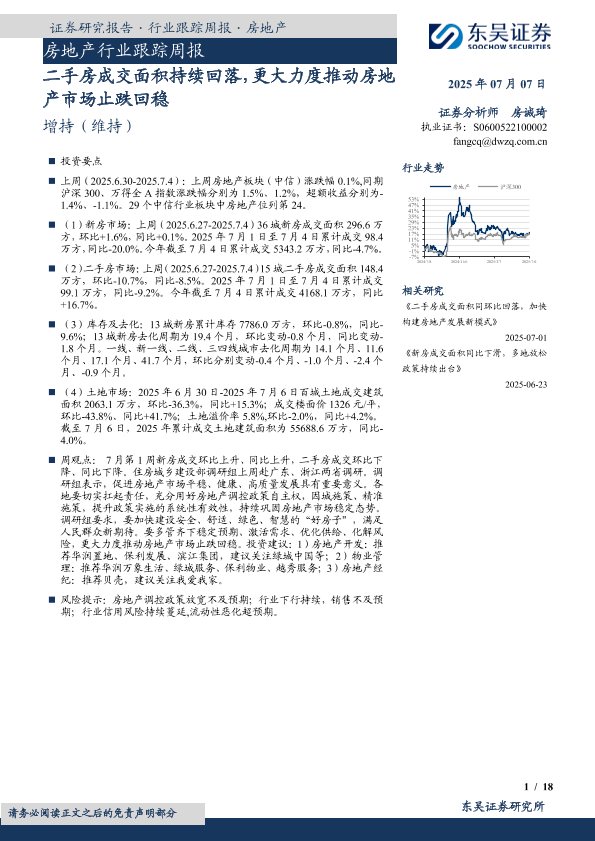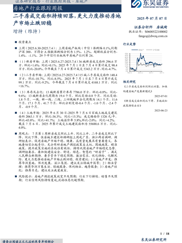 【东吴证券】【20250707】房地产行业跟踪周报:二手房成交面积持续回落,更大力度推动房地产市场止跌回稳-18页