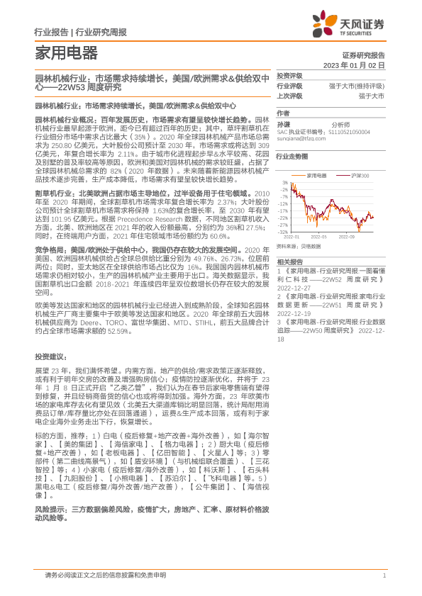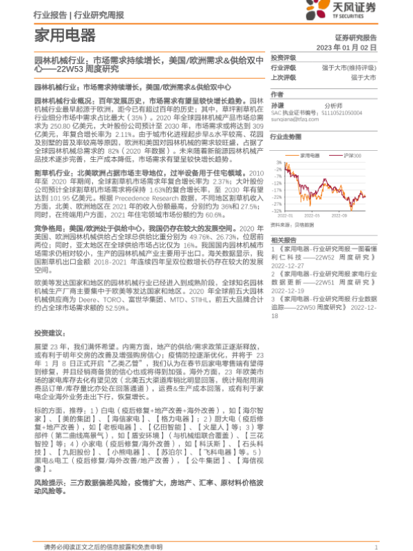 【天风证券】【20230102】家用电器行22W53周度研究:园林机械行业:市场需求持续增长,美国欧洲需求&供给双中心-15页