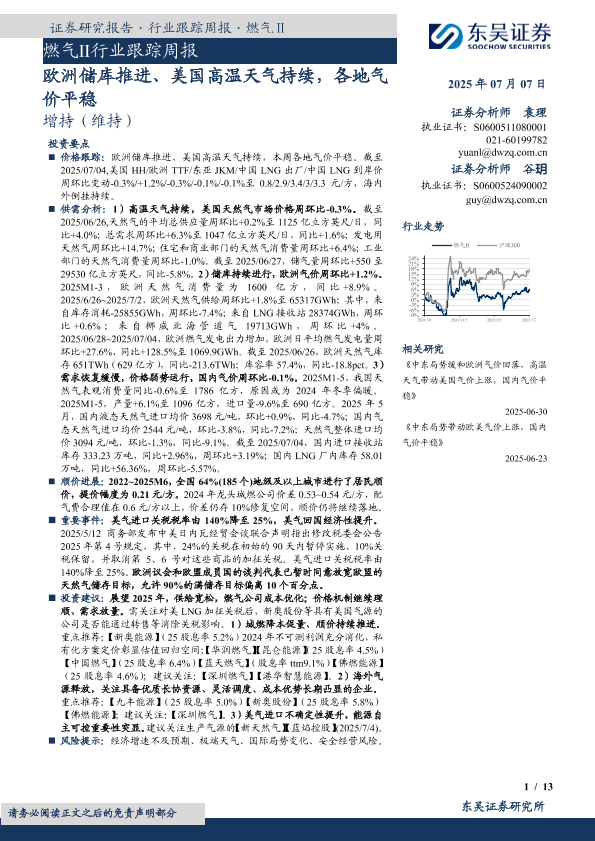 【东吴证券】【20250707】燃气Ⅱ行业跟踪周报:欧洲储库推进、美国高温天气持续,各地气价平稳-13页