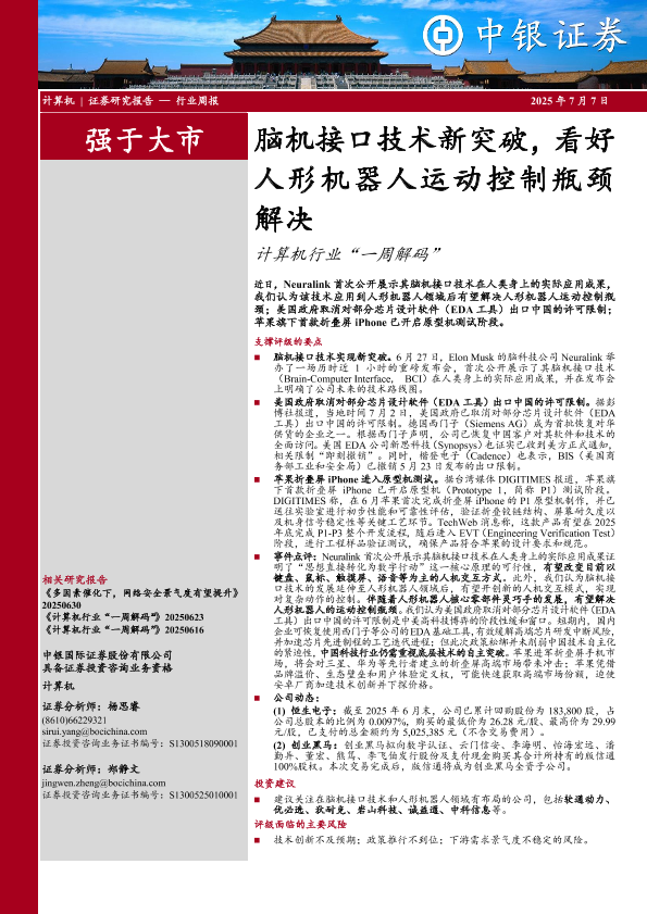【中银证券】【20250707】计算机行业“一周解码”:脑机接口技术新突破,看好人形机器人运动控制瓶颈解决-10页
