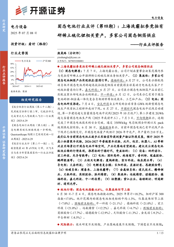 【开源证券】【20250708】固态电池行业点评(第四期):上海洗霸拟参竞拍有研稀土硫化锂相关资产,多家公司固态铜箔供应-13页