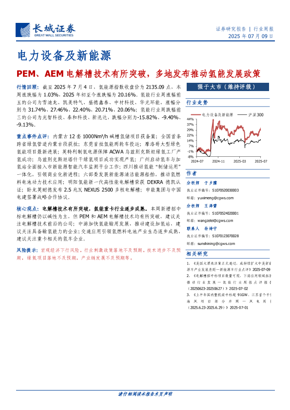 【长城证券】【20250709】电力设备及新能源行业周报:PEM、AEM电解槽技术有所突破,多地发布推动氢能发展政策-12页