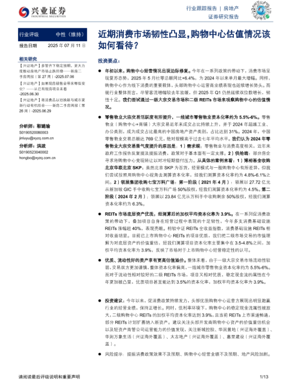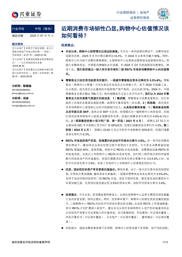 【兴业证券】【20250711】房地产行业:近期消费市场韧性凸显,购物中心估值情况该如何看待?-13页
