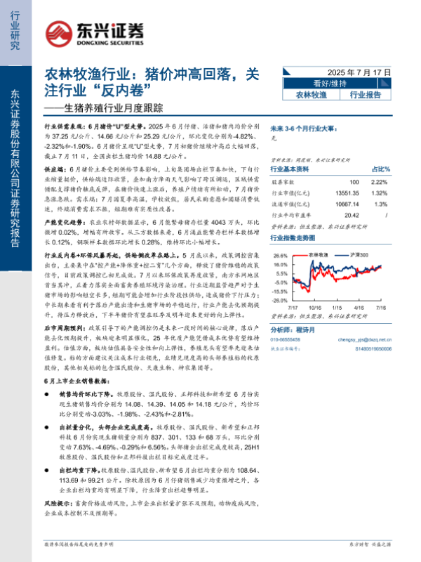 【东兴证券】【20250717】生猪养殖行业月度跟踪:猪价冲高回落,关注行业“反内卷”-12页