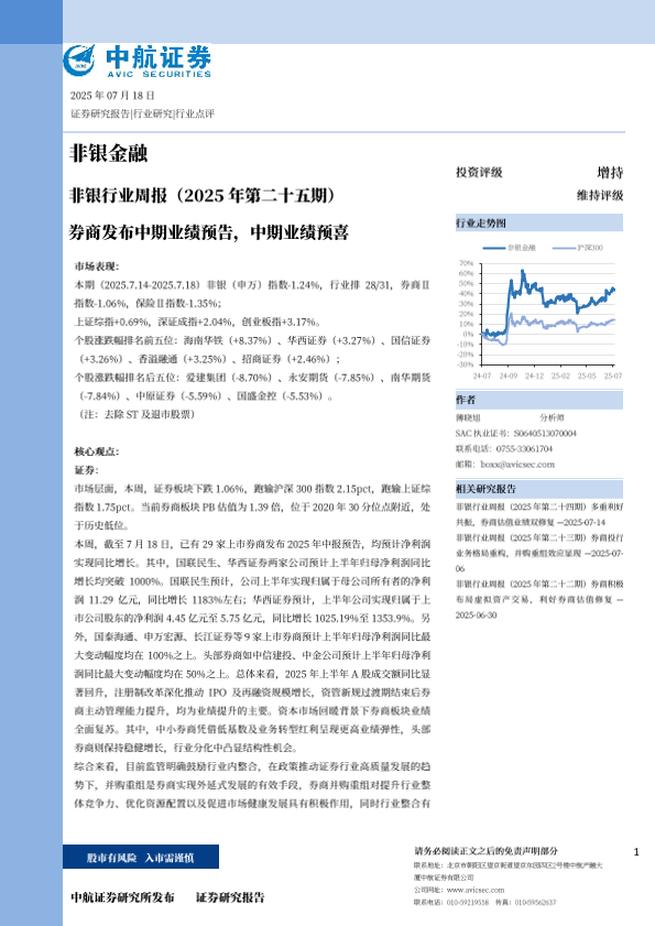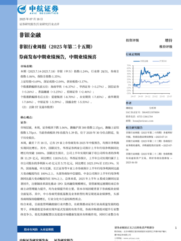 【中航证券】【20250718】非银行业周报(2025年第二十五期):券商发布中期业绩预告,中期业绩预喜-11页