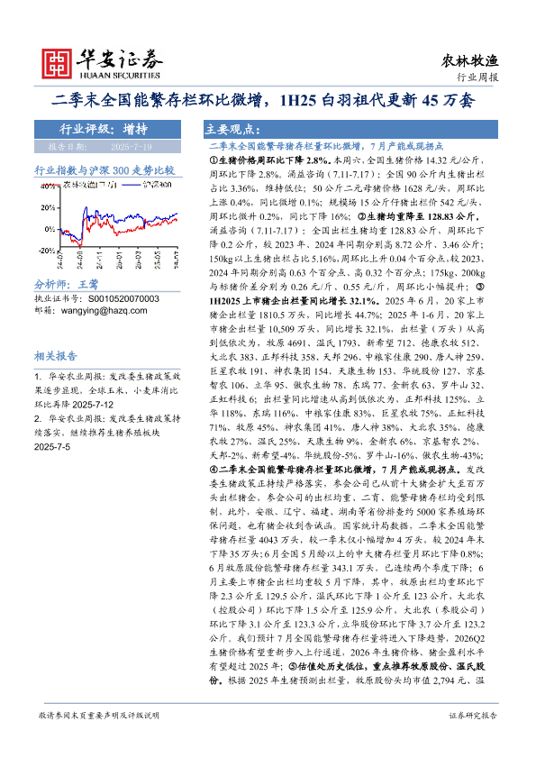 【华安证券】【20250719】农林牧渔行业周报:二季末全国能繁存栏环比微增,1H25白羽祖代更新45万套-38页