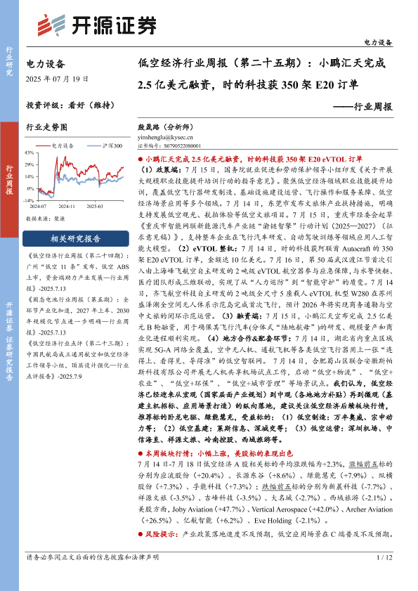 【开源证券】【20250719】低空经济行业周报(第二十五期):小鹏汇天完成2.5亿美元融资,时的科技获350架E20订单-12页