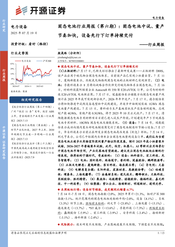 【开源证券】【20250719】固态电池行业周报(第六期):固态电池中试、量产节奏加快,设备先行下订单持续交付-13页
