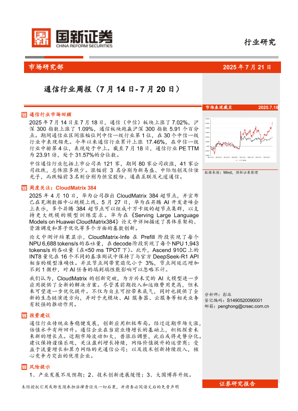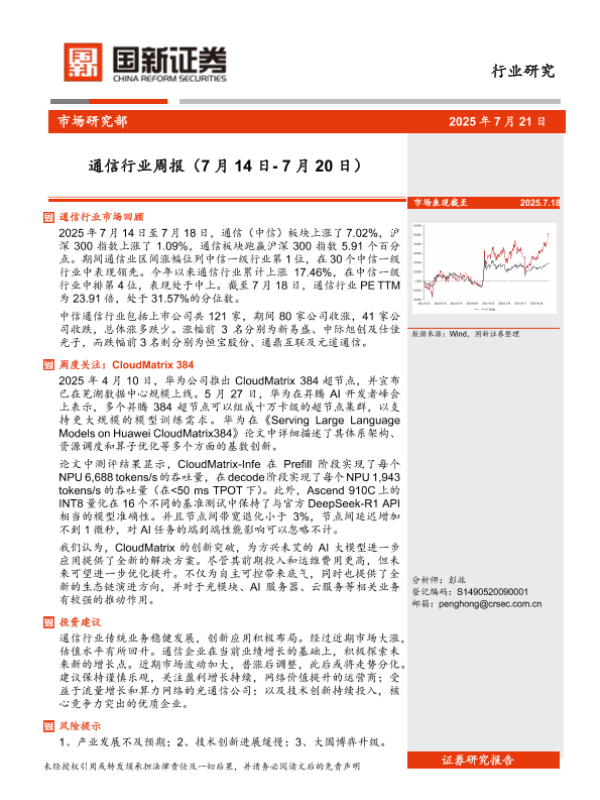 市场回顾 通信行业 投资建议 AI技术 CloudMatrix 384