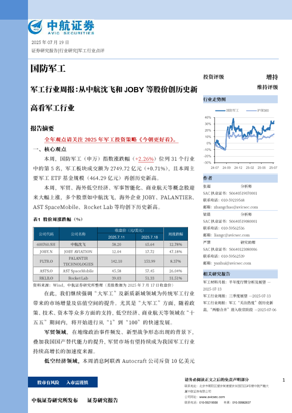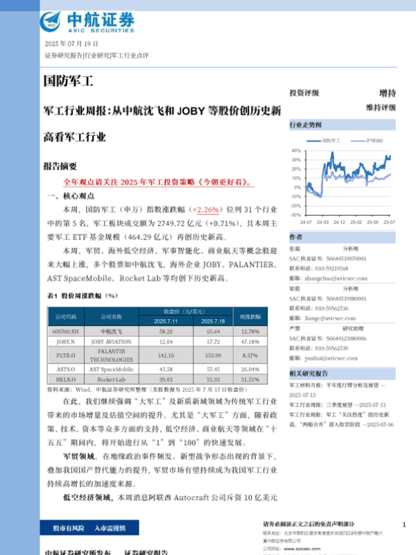 【中航证券】【20250719】军工行业周报:从中航沈飞和JOBY等股价创历史新高看军工行业-37页